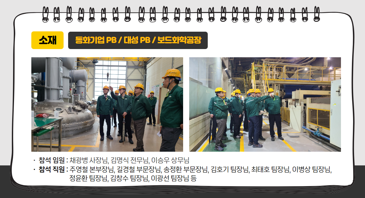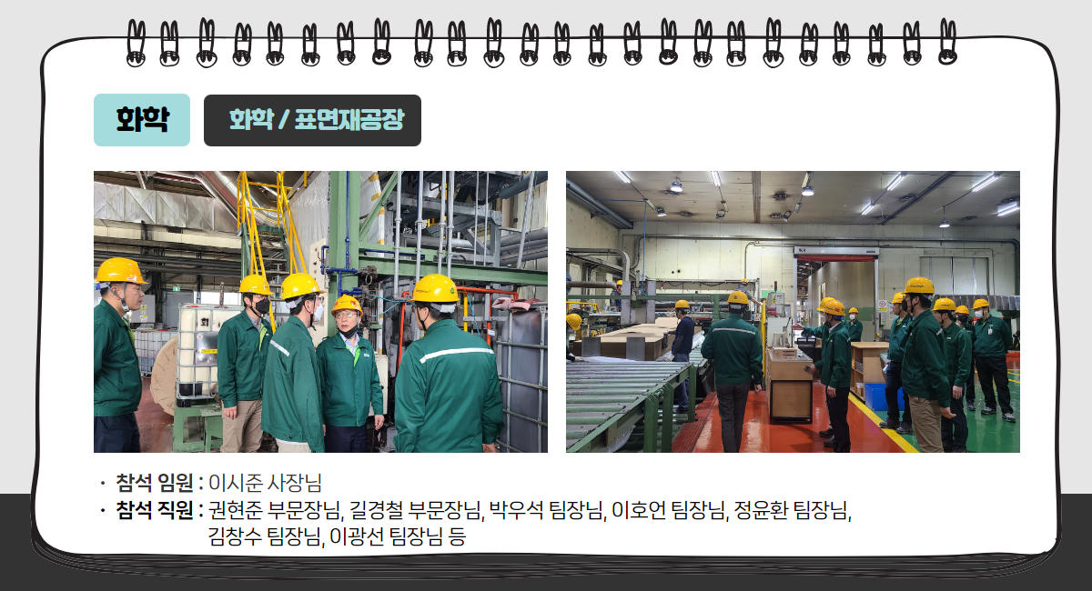 올해 상반기에는 채광병 사장과 이시준 사장 주관하에 각 사업장의 5S 활동과 현장 안전에 대한 점검이 이루어졌다. 4월 11일 동화PB·대성PB·보드화학공장을 시작으로 4월 12일 MDF2·가공보드·강화마루공장, 4월 13일 태양합성, 4월 17일 화학·표면재공장, 5월 8일 아산MDF공장, 5월 12일 동화일렉트로라이트, 5월 24일 중앙연구소 순으로 진행됐다. 경영자가 직접 현장을 방문해 소통하고, 직원들은 각자의 자리에서 꾸준하게 5S 활동과 안전에 관심을 기울이는 양방향 노력이 더해지면서 동화 전 사업장은 보다 빠르게 안전하고 효율적인 공간으로 개선되고 있다.