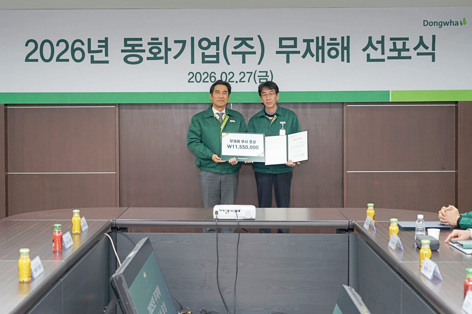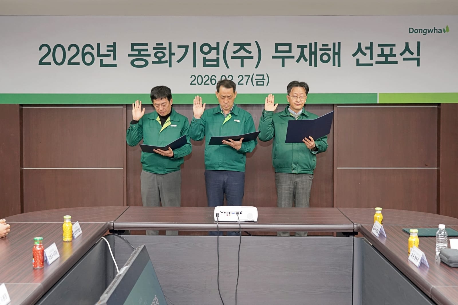 동화기업이 2월 27일 금요일 인천 가좌동 본관에서 '2026 무재해 선포식 및 2025년 우수부서 포상식'을 개최했다. 무재해 선포식은 사업장 내 산업재해 근절을 목표로 한해의 무사고 달성을 다짐하는 자리. 2026년 동화기업의 무재해 달성을 위해 채광병 동화기업 대표, 김명식 부사장을 비롯해 노조위원장, 공장장, 안전보건관리책임자 등 임직원과 협력업체들이 한 자리에 모였다.