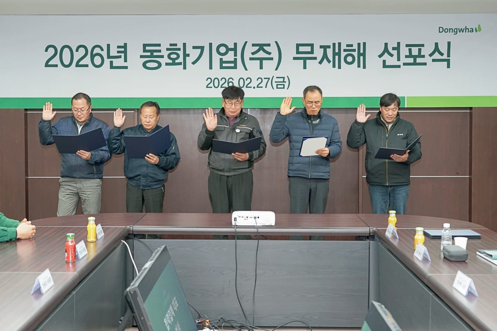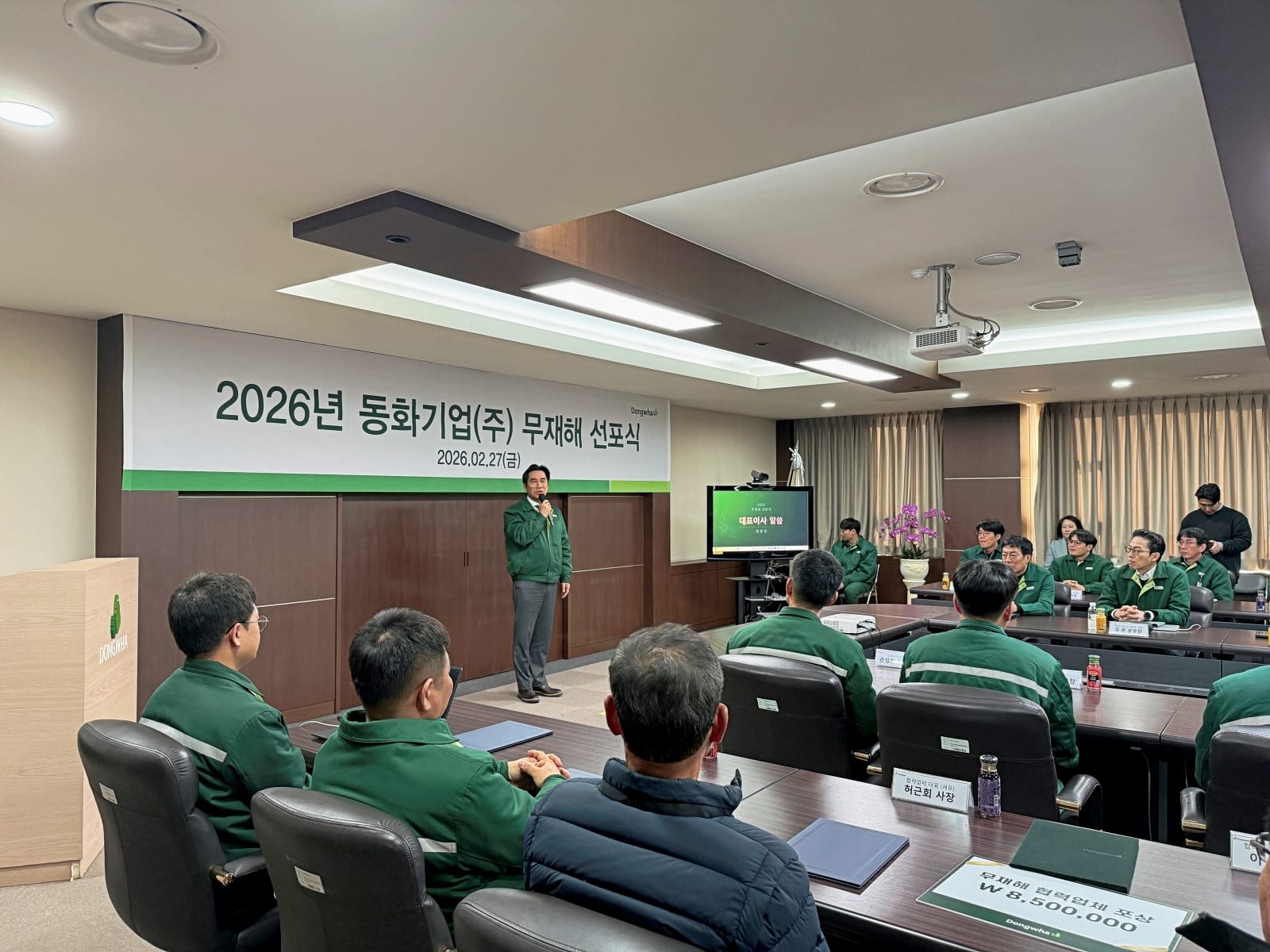 동화기업이 2월 27일 금요일 인천 가좌동 본관에서 '2026 무재해 선포식 및 2025년 우수부서 포상식'을 개최했다. 무재해 선포식은 사업장 내 산업재해 근절을 목표로 한해의 무사고 달성을 다짐하는 자리. 2026년 동화기업의 무재해 달성을 위해 채광병 동화기업 대표, 김명식 부사장을 비롯해 노조위원장, 공장장, 안전보건관리책임자 등 임직원과 협력업체들이 한 자리에 모였다.