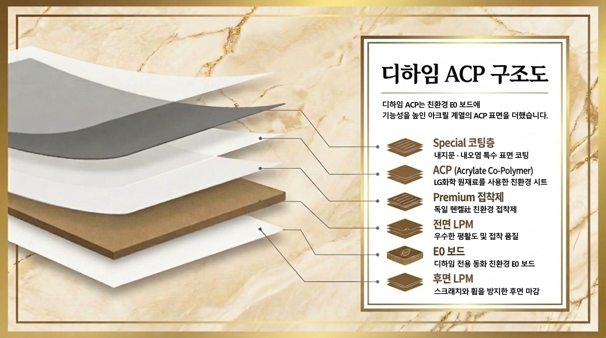 먼저 '디하임 ACP'는 디하임 전용 동화 친환경 E0 보드에 기능성을 높인 아크릴 계열의 친환경 신소재 ACP를 적용한 제품입니다. 상단에는 Special 코팅층을 더해 각종 지문과 오염에 강해 관리가 편리합니다.