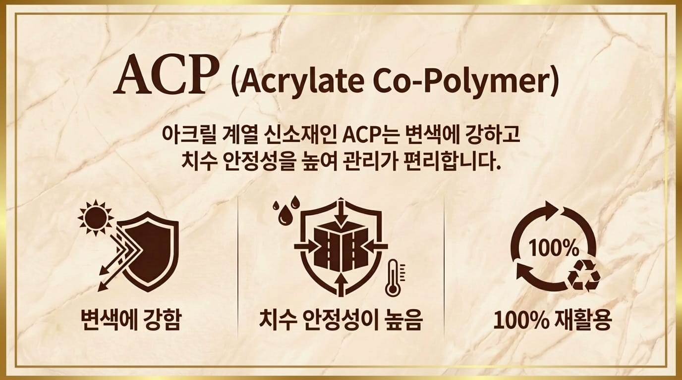'ACP (Acrylate Co-Polymer)'란, 아크릴 계열의 신소재로 관리가 편하고 100% 재활용이 가능한 친환경 표면재입니다. ACP 표면재는 변색에도 강하고 치수 안정성이 우수해 시간이 지나도 깔끔한 외관을 유지할 수 있다는 장점이 있습니다.