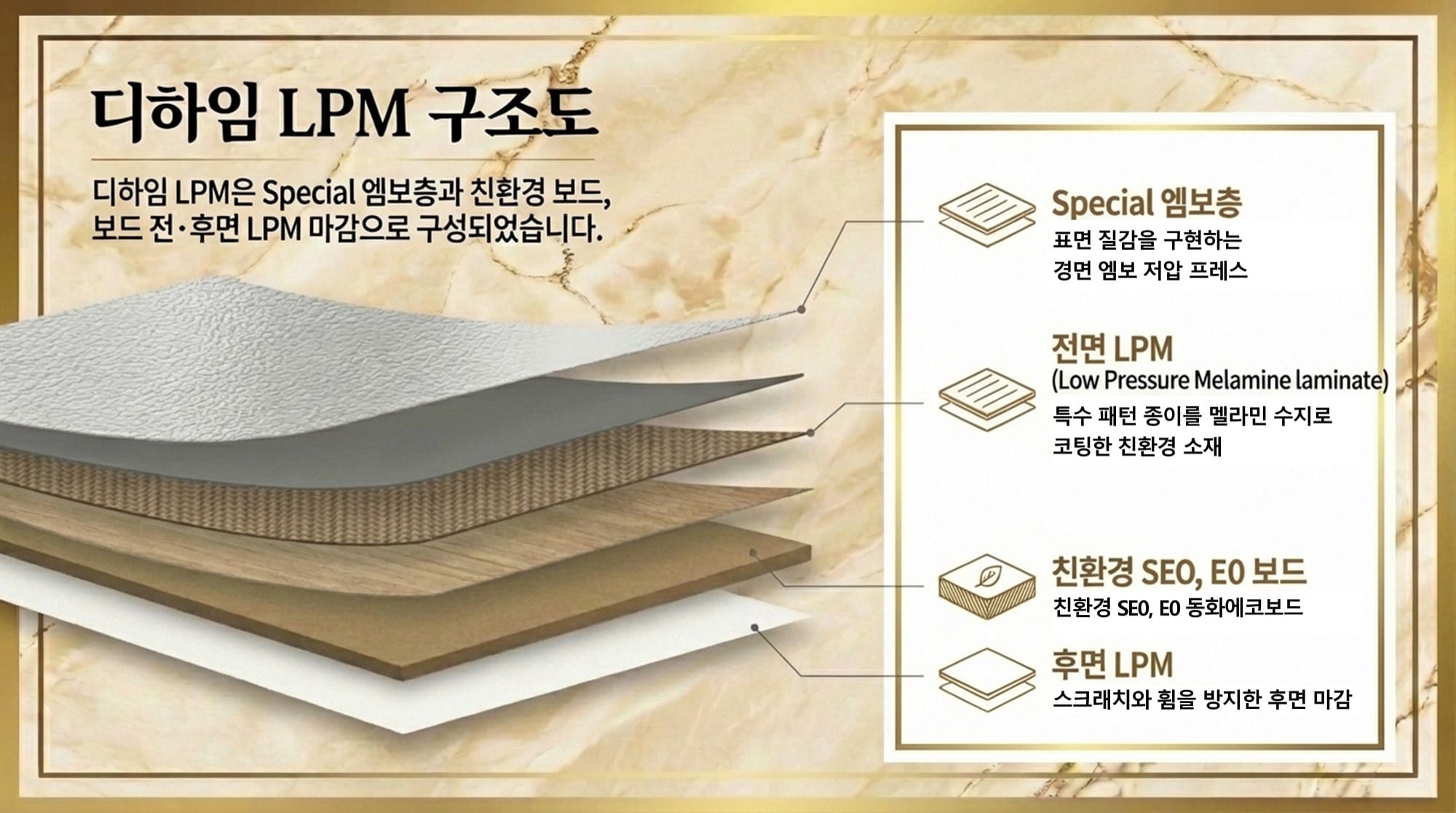 한편, '디하임 LPM'은 친환경 보드에 내구성이 우수한 고강도 LPM 표면재를 적용한 라인업입니다. 전면과 후면에 LPM을 부착해 접착 품질과 내구성을 높였습니다. 상단에는 Special 엠보층을 더해 섬세한 표면 질감을 구현했습니다.