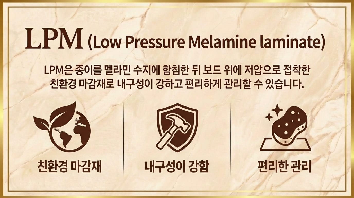 'LPM (Low Pressure Melamine)'은 종이를 멜라민 수지에 함침한 뒤 저압으로 접착한 친환경 마감재입니다. 내스크래치성과 내오염성이 뛰어나 관리가 편리하고 오랜 시간 깔끔하게 사용할 수 있습니다.