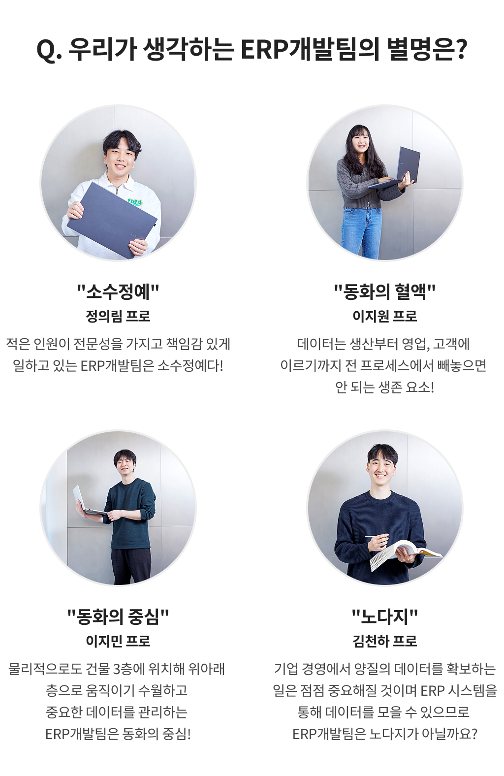 💬 이지민 목재, 화학, 오토라이프, 미디어 등 다양한 산업을 다루는 만큼 프로세스가 중요한 ERP 영역에서 성장을 이끌어낼 수 있는 곳이라고 생각해 지원했습니다.