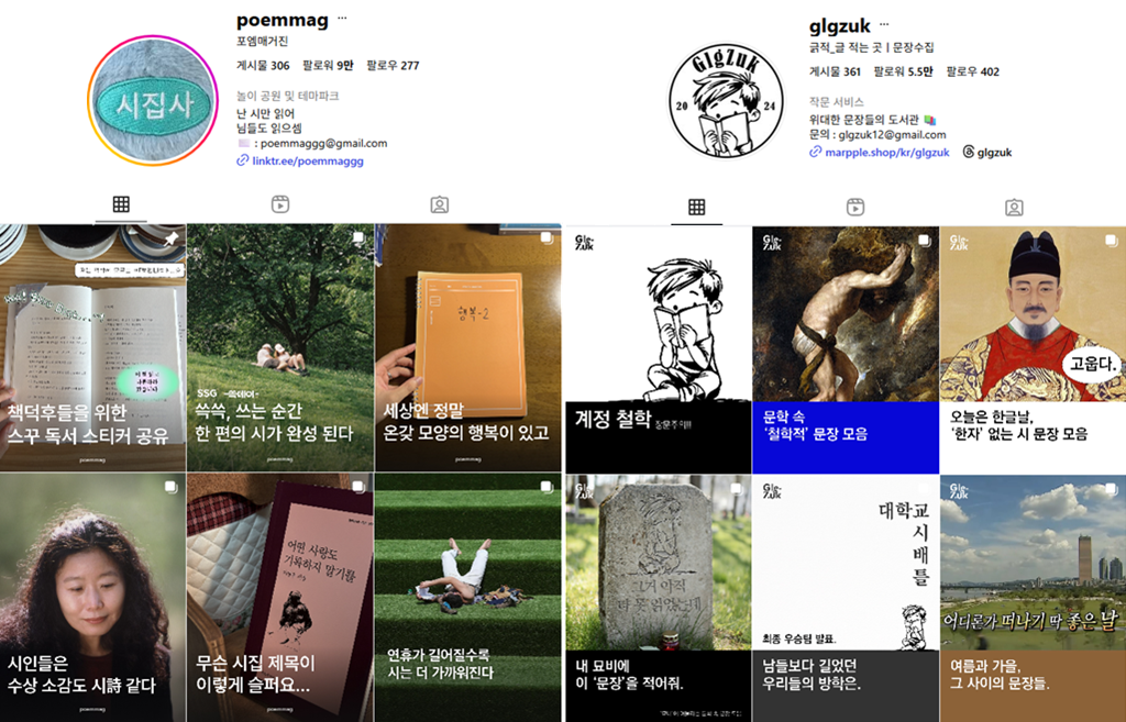 SNS에서는 '한 문장 챌린지', '북 밈 챌린지'가 유행처럼 번지고 있다. 사용자들은 자신이 좋아하는 문장을 이미지로 만들어 공유하고, 댓글로 공감한다. 짧은 텍스트는 밈처럼 퍼지고, 문장은 곧 감정 공유의 매개체가 된다. 인스타그램에는 문장만 큐레이션하는 계정이 늘고, 마켓과 연계해 '문장 굿즈', '책 인용 머그컵', '활자 키링'을 내놓는다. 문학 인플루언서가 팔로어들과 '대학교 시배틀'을 열고, 기업 지원을 받아 콜래버레이션으로 문학 공모전도 개최한다. 글을 읽는 일이 감성 콘텐츠로, 그리고 트렌드 마케팅의 소재로 확장되는 것이다.